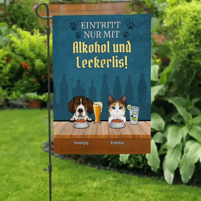 Eintritt nur mit Alkohol & Leckerli - Individuelle Gartenflagge